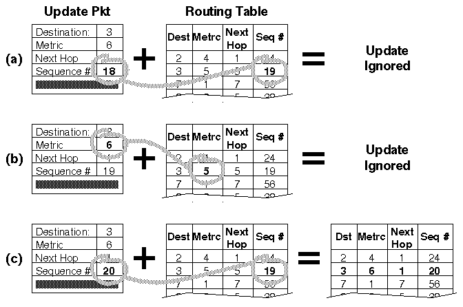 To distinguish stale update packets from valid ones, each update packet is tagged by the original node with a sequence number. The sequence number is a monotonically increasing number which uniquely identifies each update packet from a given node. Consequently, if a node receives an update packet from another node, the sequence number must be equal to or greater than the sequence number already in the routing table; otherwise the update packet is stale and ignored. If the sequence number matches the sequence number in the routing table, then the metric is compared and updated as previously discussed.