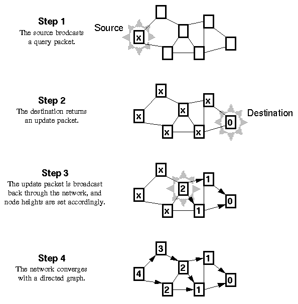 At each node in the network, a logically separate copy of TORA is run for each destination. When a node needs a route to a particular destination, it broadcasts a route query packet containing the address of the destination. This packet propagates through the network until it reaches either the destination, or an intermediate node having a route to the destination. The recipient of the query packet then broadcasts an update packet listing its height with respect to the destination (if the recipient is the destination, this height is 0). As this packet propagates back through the network, each node that receives the update sets its height to a value greater than the height of the neighbor from which the update was received. This has the effect of creating a series of directed links from the original sender of the query to the node that initially generated the update. An example of this process is illustrated in Figure 3.1.